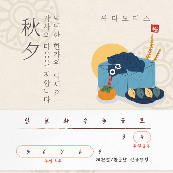2025년 10월 4일(토) ~ 10월 8일 (수)요일 추석연휴 전지점 휴무공지입니다.